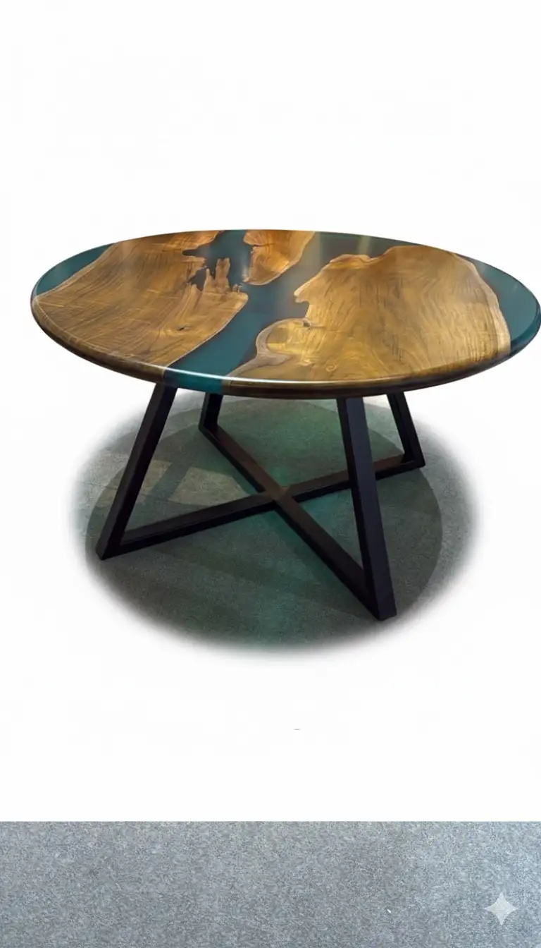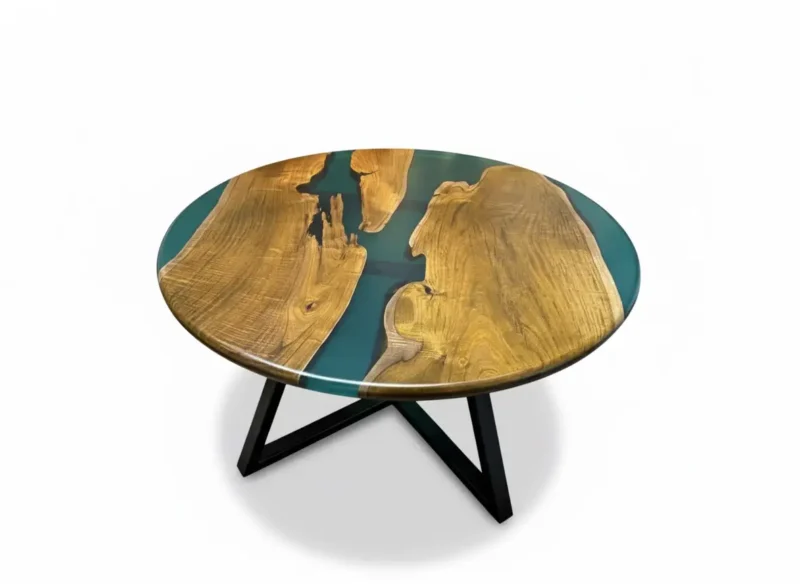 • Aqua Blue Epoxy Resin “Lagoon”: A striking, deep aqua blue epoxy resin is hand-poured to create a vibrant “river” or “lagoon” that flows through the organic, live edges of the wood. This high-gloss finish not only protects the wood but also adds an incredible depth and reflective brilliance to the surface, mimicking clear water.
