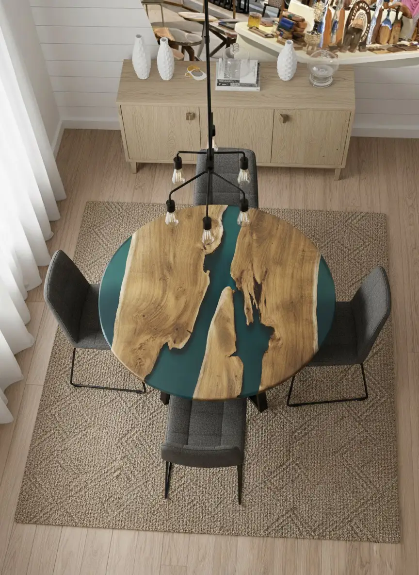 Bring the vibrant tranquility of a tropical lagoon into your dining space with this breathtaking, bespoke round table. Merging the enduring strength of natural wood with modern design, The Aqua Lagoon is a functional centerpiece designed to inspire conversation.
