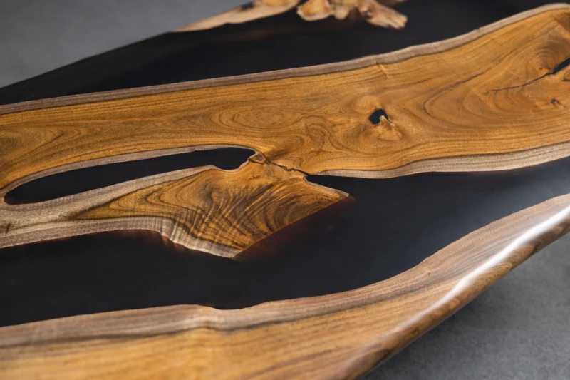 Hand crafted furniture piece built using Desert Rohida wood, seamlessly blended with dark grey resin to highlight its unique live-edge silhouette. The rich PU matte finish adds depth and drama, making it a true centerpiece in any dining space. The solid wooden base in a sleek black polish offers both strength and contrast, ensuring this table is as sturdy as it is striking.