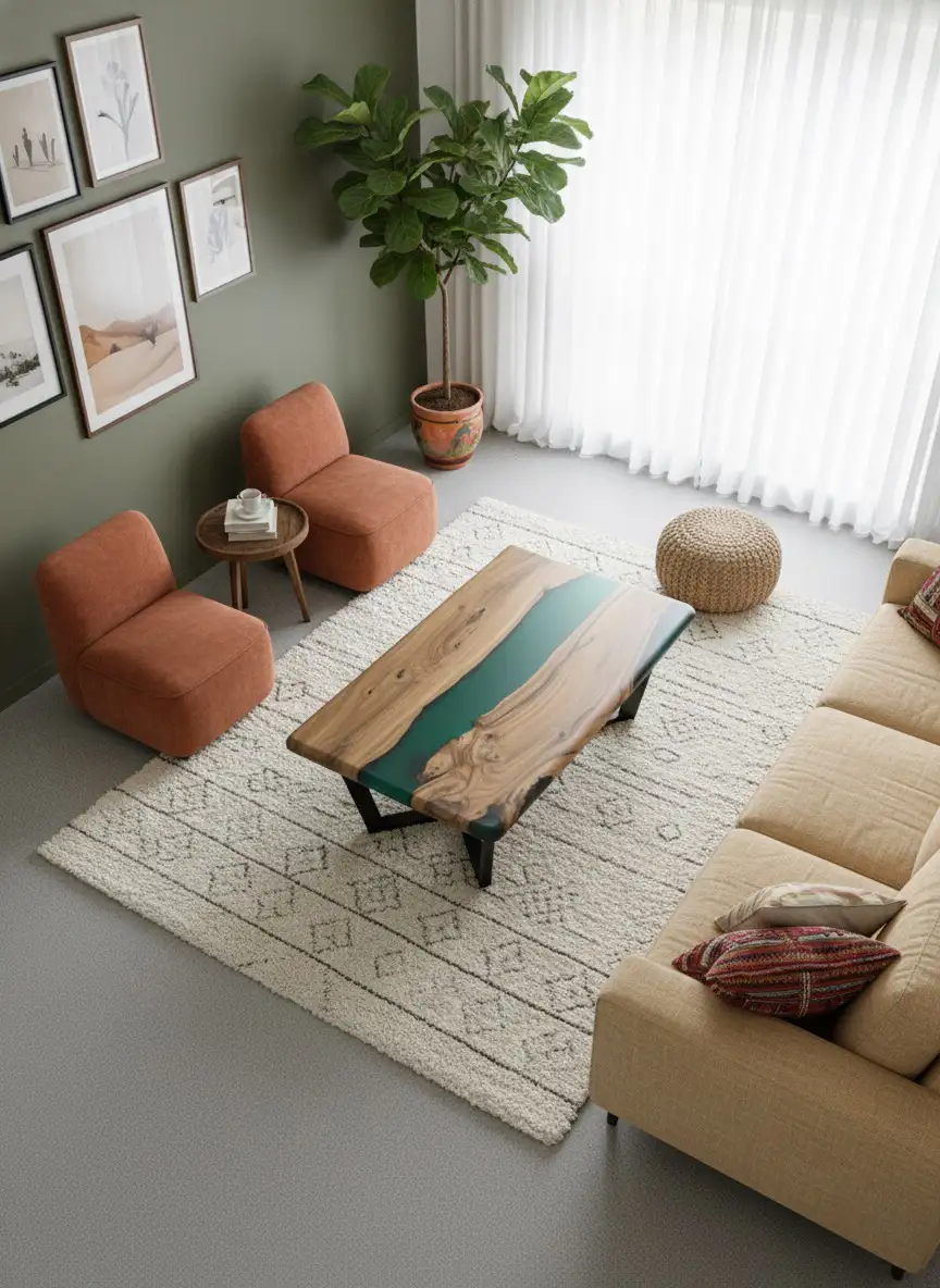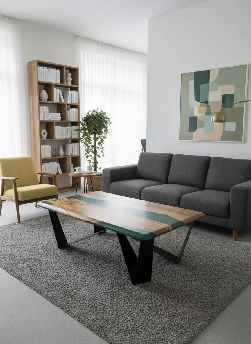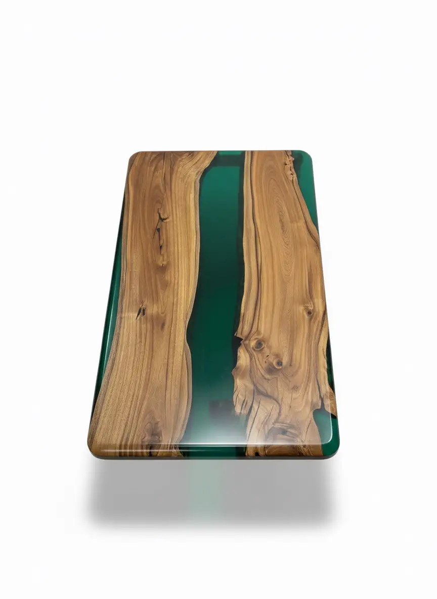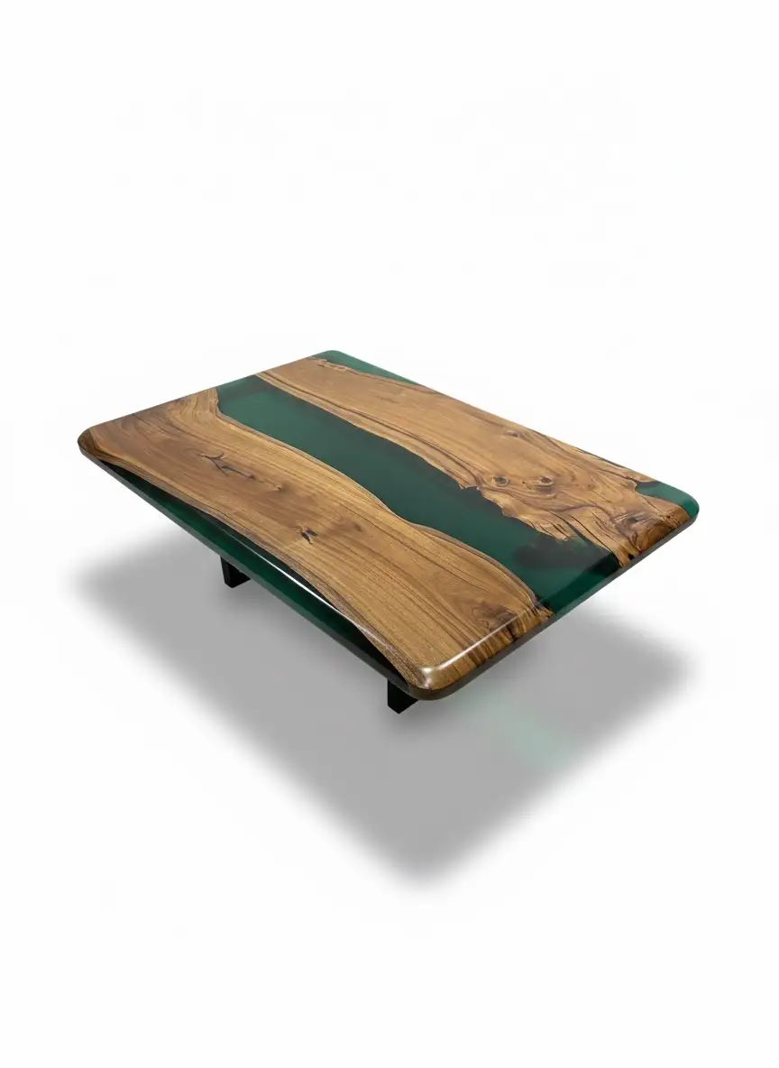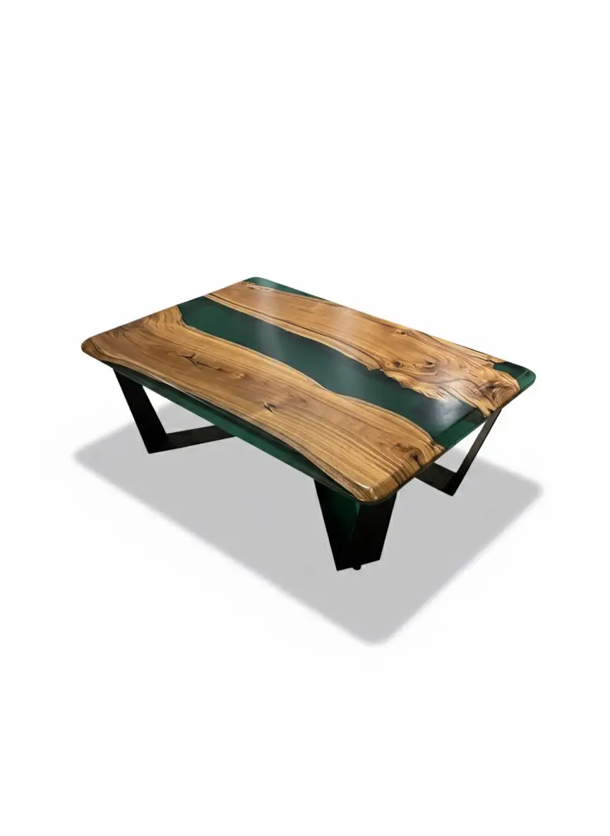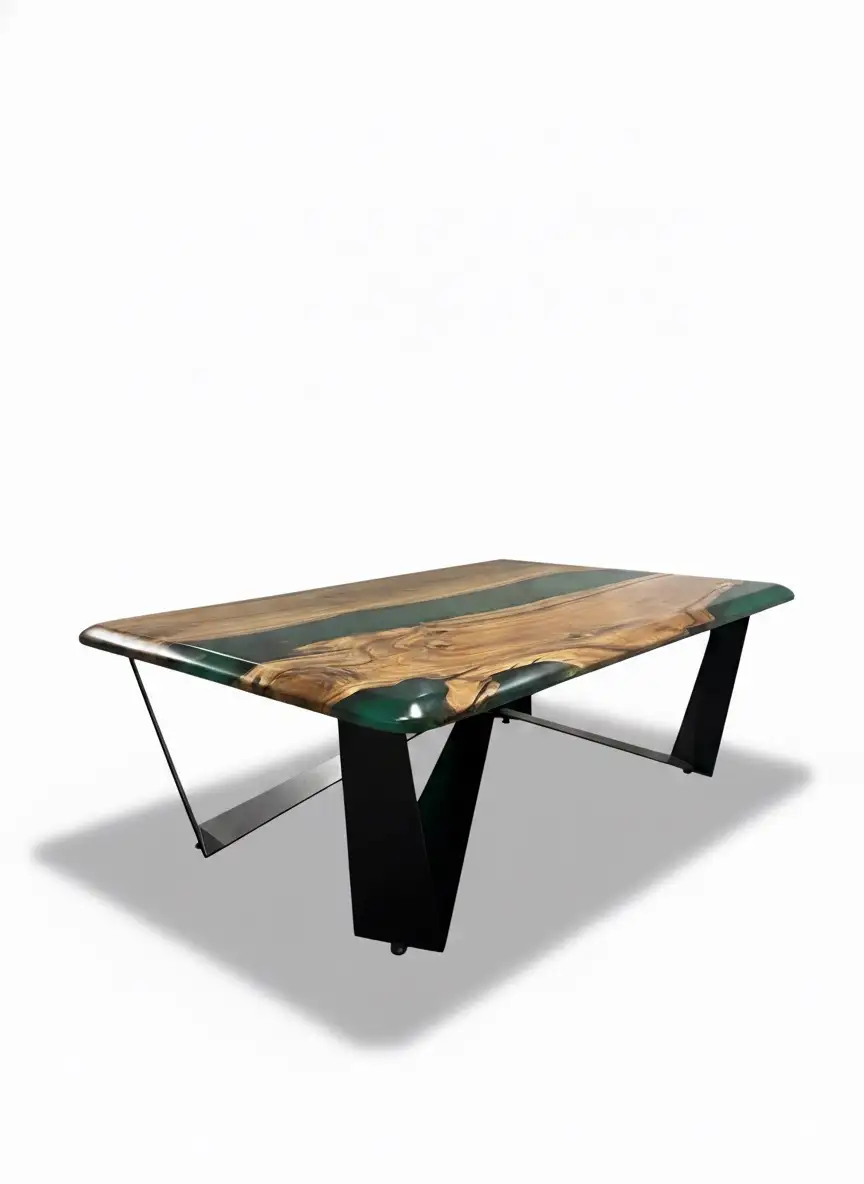 • Aqua Green Epoxy Resin: A mesmerizing Aqua Green epoxy is meticulously poured to fill the natural voids, creating a vivid, transparent “canyon” or “river” running through the table. The high-gloss, crystal-clear finish provides a resilient, smooth surface that is easy to maintain.