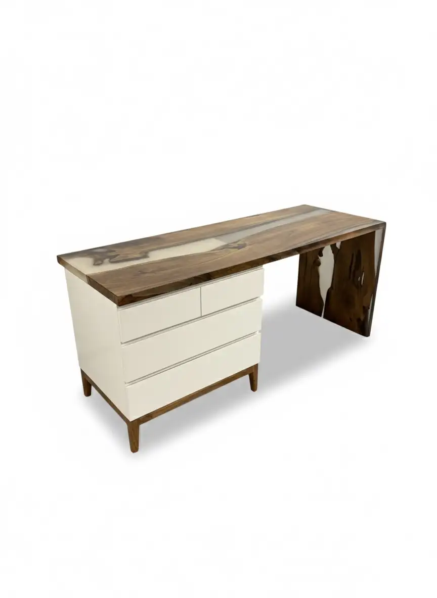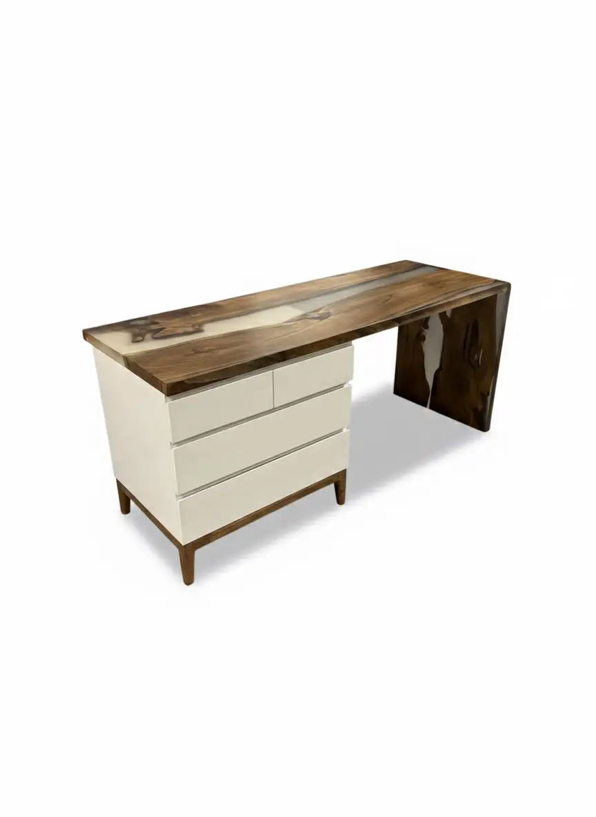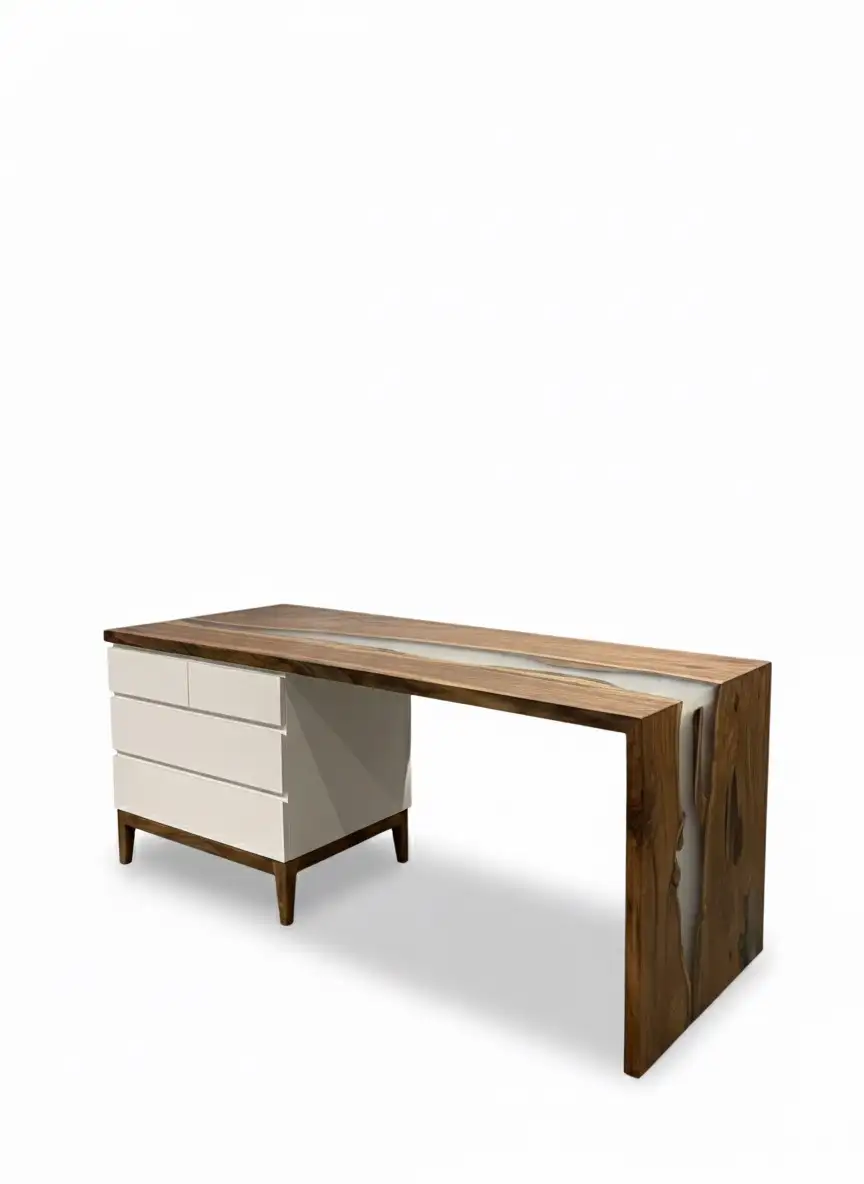 The desk is elegantly anchored by tapered wooden legs on the storage side, maintaining a warm, cohesive feel with the natural aesthetic. Whether used for work, creative projects, or simply as a signature piece, The Meridian Waterfall Desk is the ultimate statement in functional luxury.