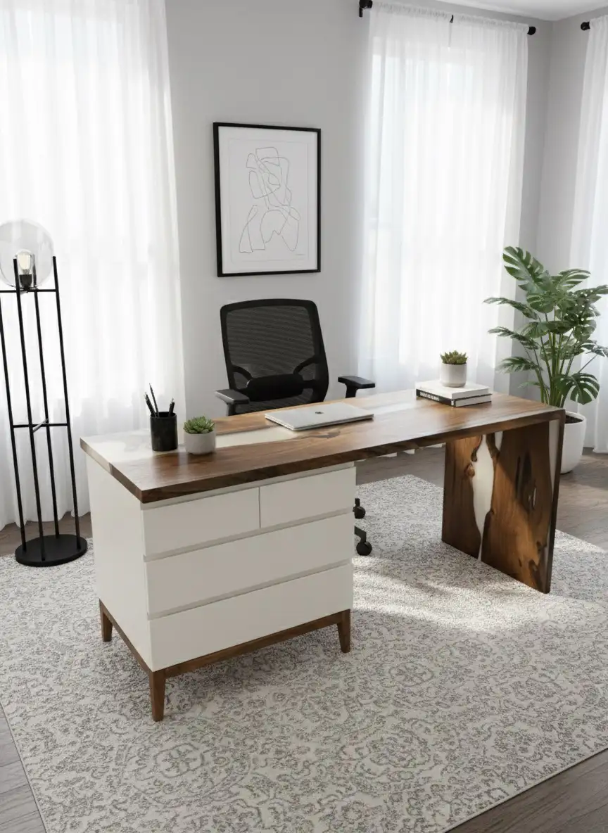 In striking contrast to the warm, natural wood, the left side features a clean, architectural storage unit. This box is constructed from durable HDMR (High-Density Moisture Resistant board) and finished with a flawless, bright PU (Polyurethane) coating. This seamless white surface houses three spacious drawers, providing ample concealed storage to keep your workspace pristine and organized.