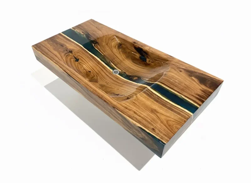 • Aqua Green Epoxy River: A vibrant Aqua Green epoxy resin is strategically placed to enhance the wood’s natural shape, flowing down the center like a crystalline river. The light-catching transparency of the resin beautifully contrasts with the rich wood, creating a striking visual line.