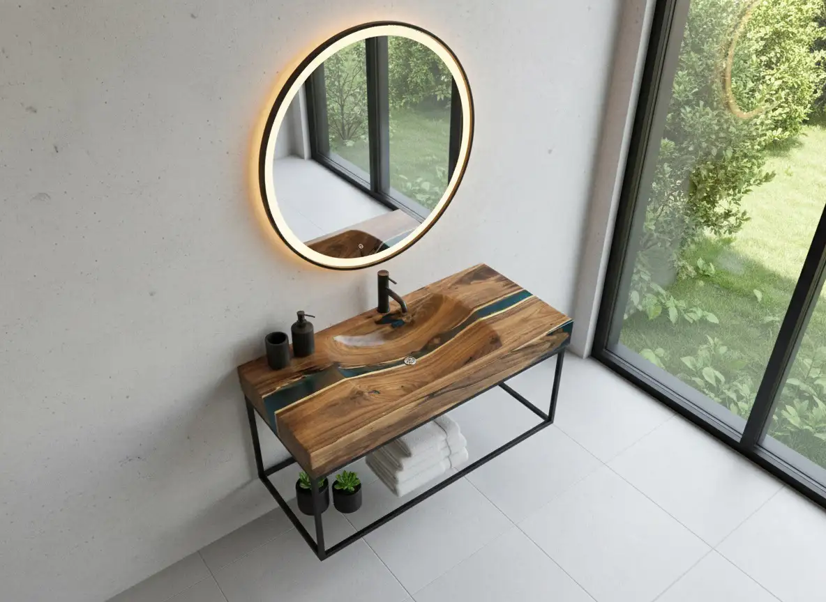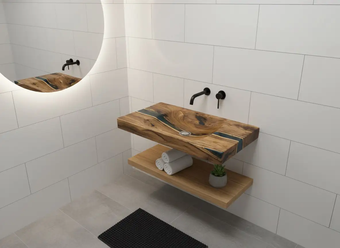 Unlike standard porcelain, this basin is a fully integrated, sculptural basin and countertop crafted from a single slab. It is designed for maximum visual impact and features a premium, high-gloss epoxy coating across all surfaces. This specialized, thick coating seals the wood entirely, providing superior, lasting water resistance and durability essential for daily bathroom use.
