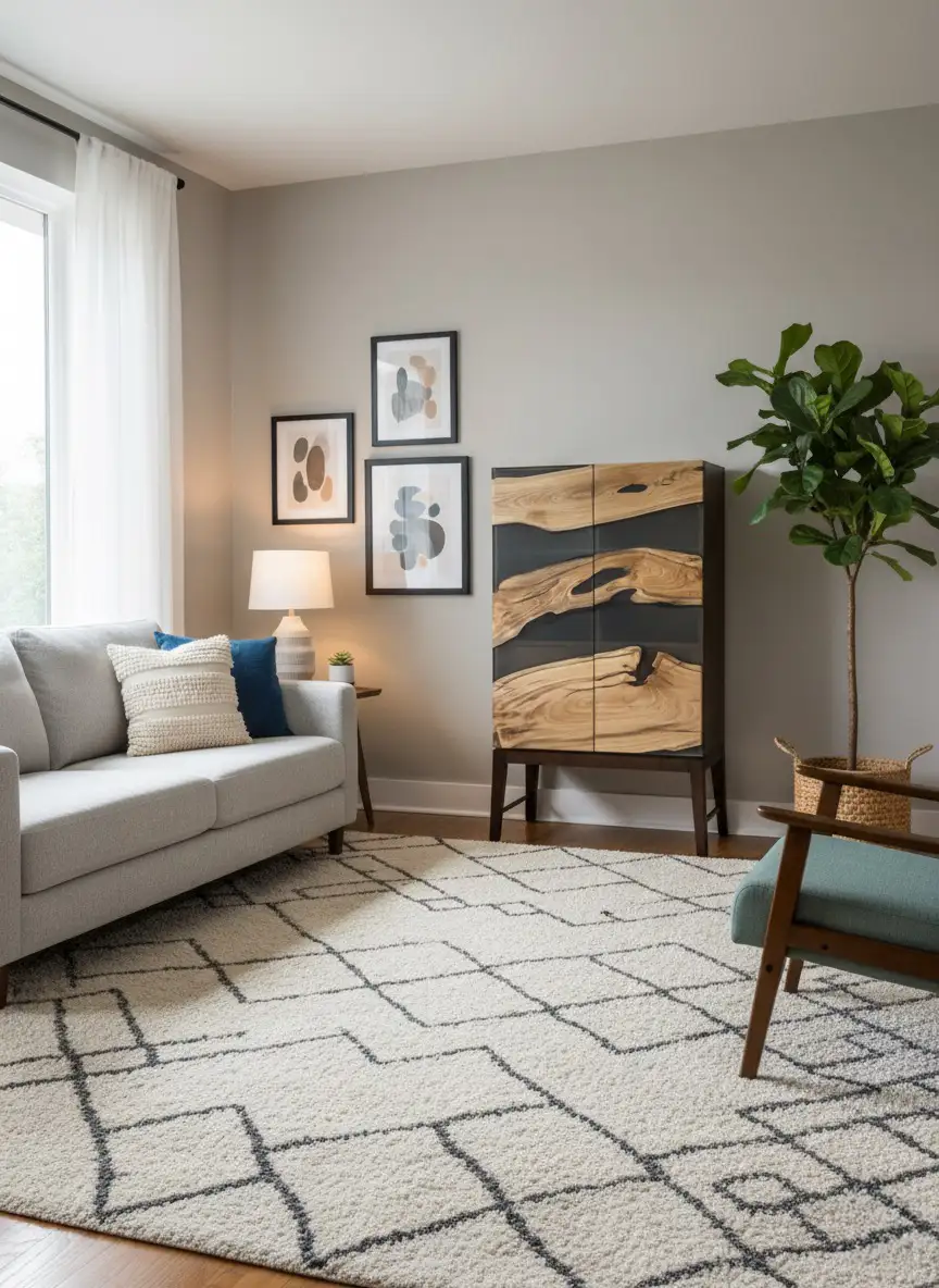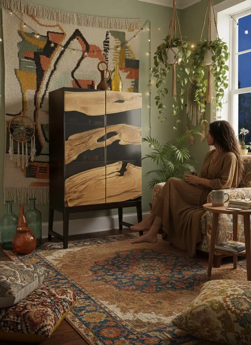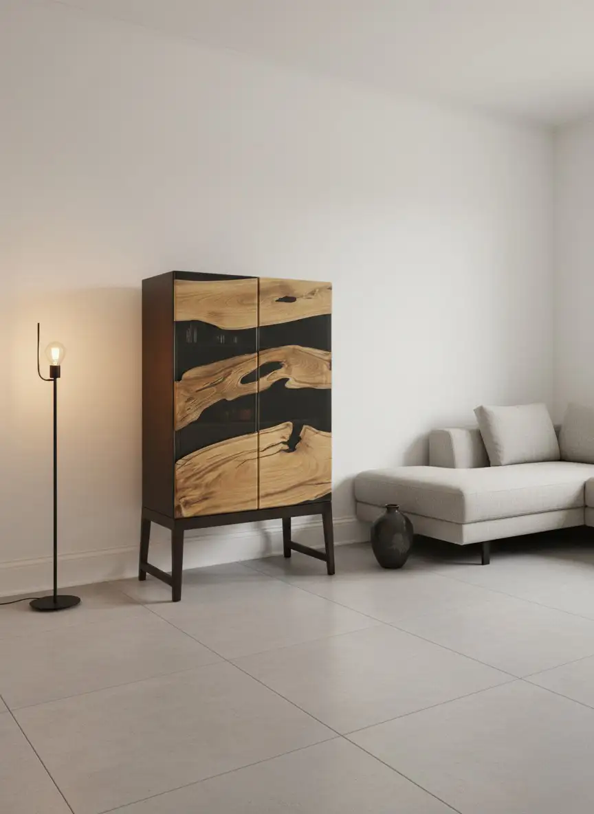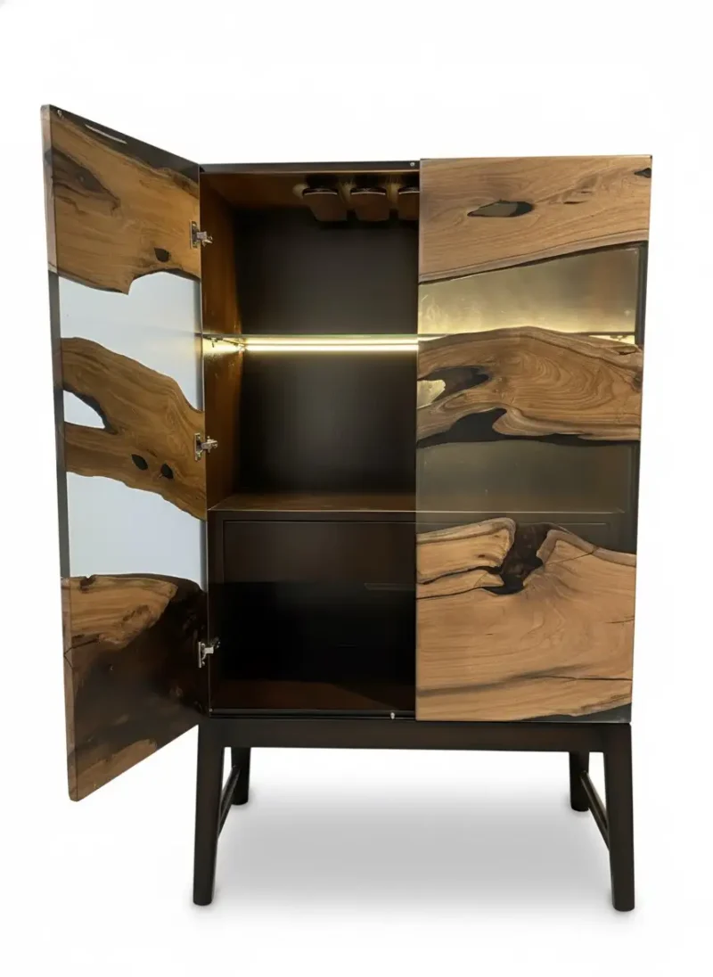 • Striking Front Panels: The four doors feature hand-fitted Rohida Wood (Desert Teak) slabs, characterized by their beautiful grain and natural live edges. These slabs are set within a transparent, Smoky Grey Epoxy Resin, creating a mesmerizing, cloud-like flow across the facade. This unique design provides subtle visibility into the cabinet’s contents while protecting the wood and adding a high-gloss finish.