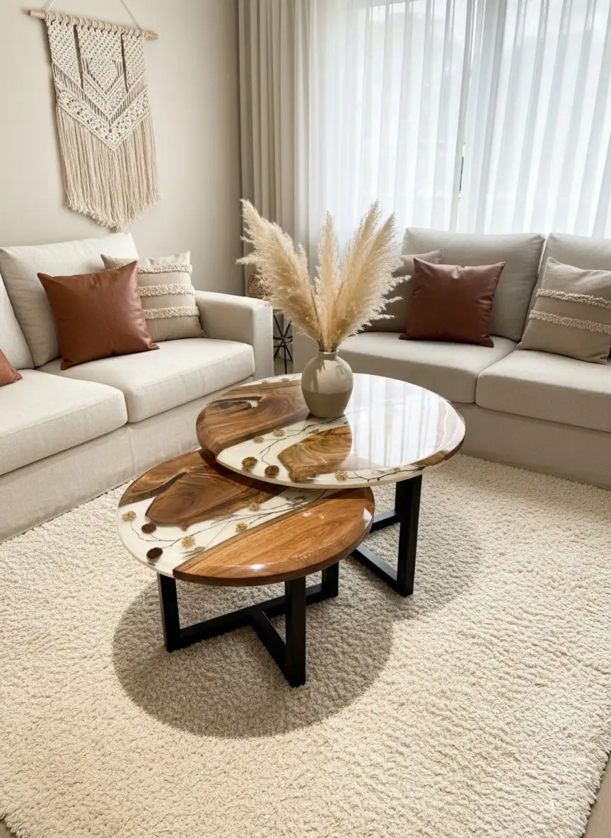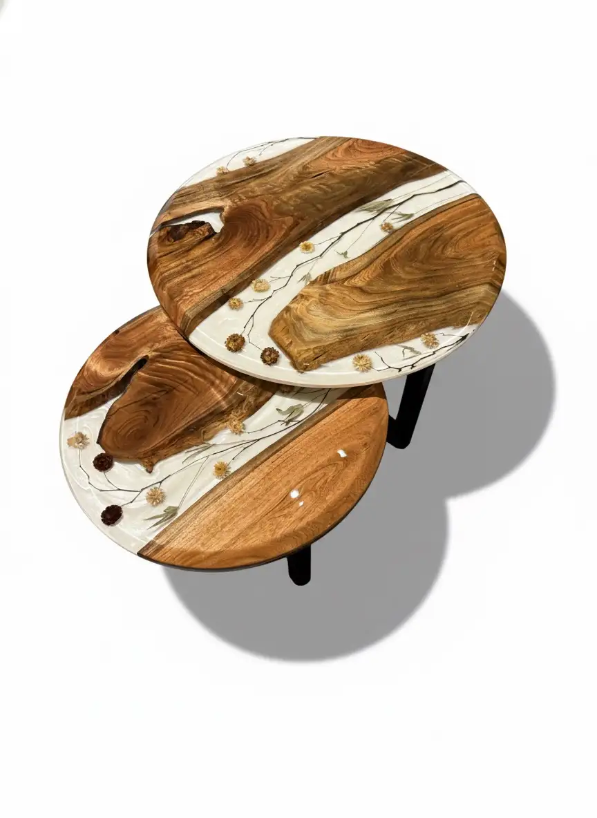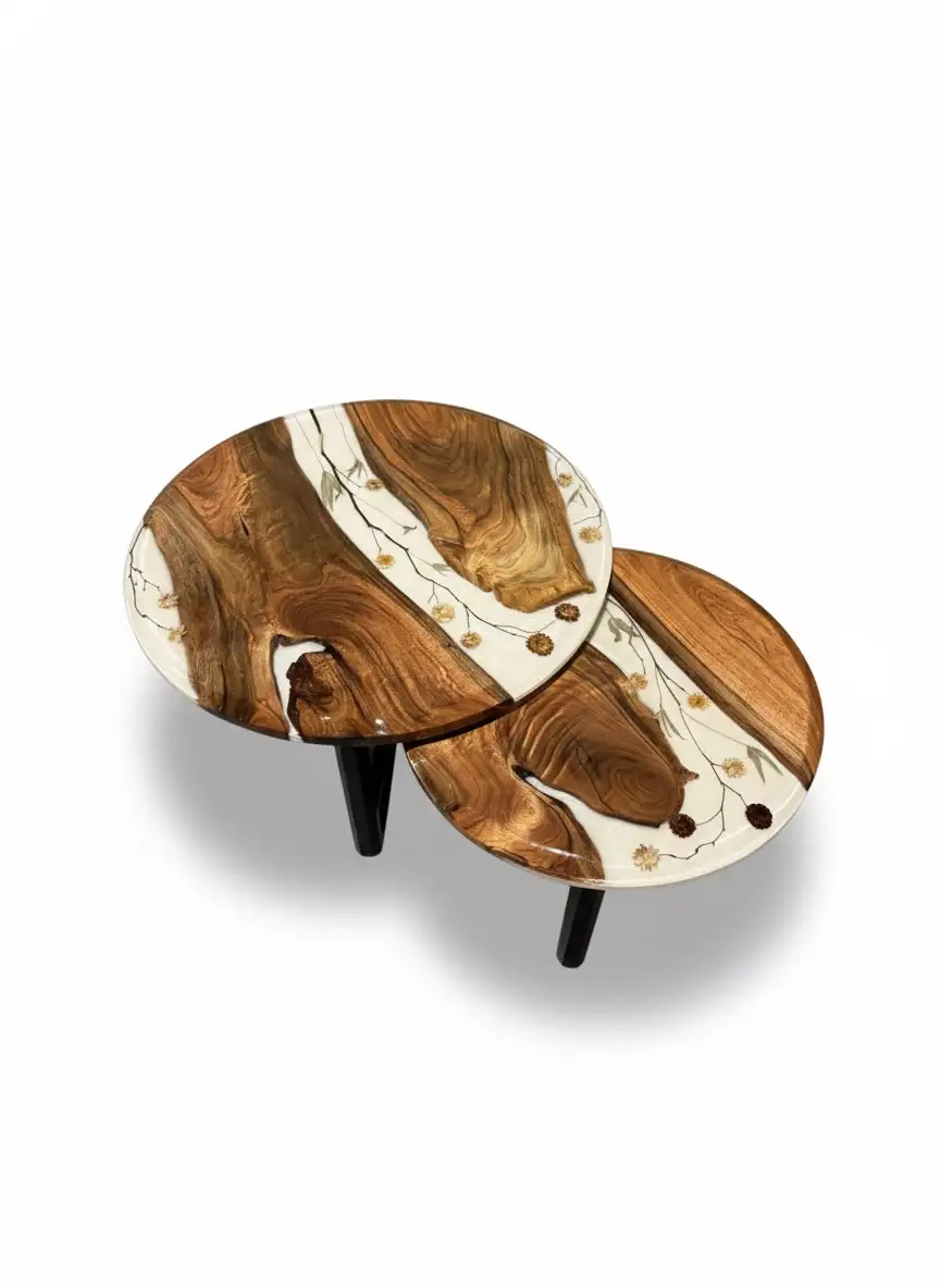 • Unique Floral Resin Design: The signature feature is the central white epoxy resin river that flows through both tabletops, preserving delicate dried flowers, buds, and botanicals. This unique embedment gives the tables an ethereal, one-of-a-kind appearance. Sleek & Sturdy Wood Base: Each tabletop is securely mounted on solid wood legs finished with a durable black Deko coating. This sophisticated, matte black finish on the wooden base provides stable support and enhances the contemporary aesthetic, creating a cohesive, high-end look.