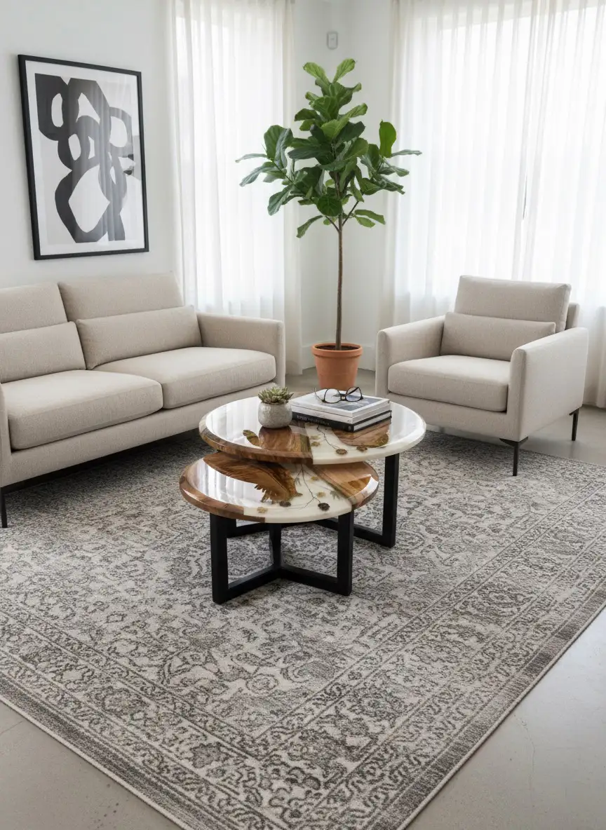 Elevate your living space with the artistry of The Floral River Nesting Tables. This exquisite set transforms functional furniture into a captivating piece of natural history, perfect for modern and luxury interiors.
