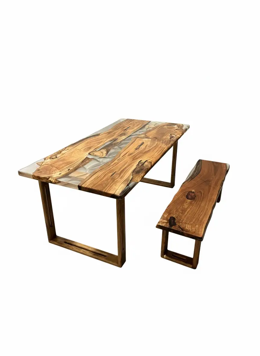 Luxury Rohida Wood & 3D Transparent Epoxy Dining Table with Matching Live Edge Bench