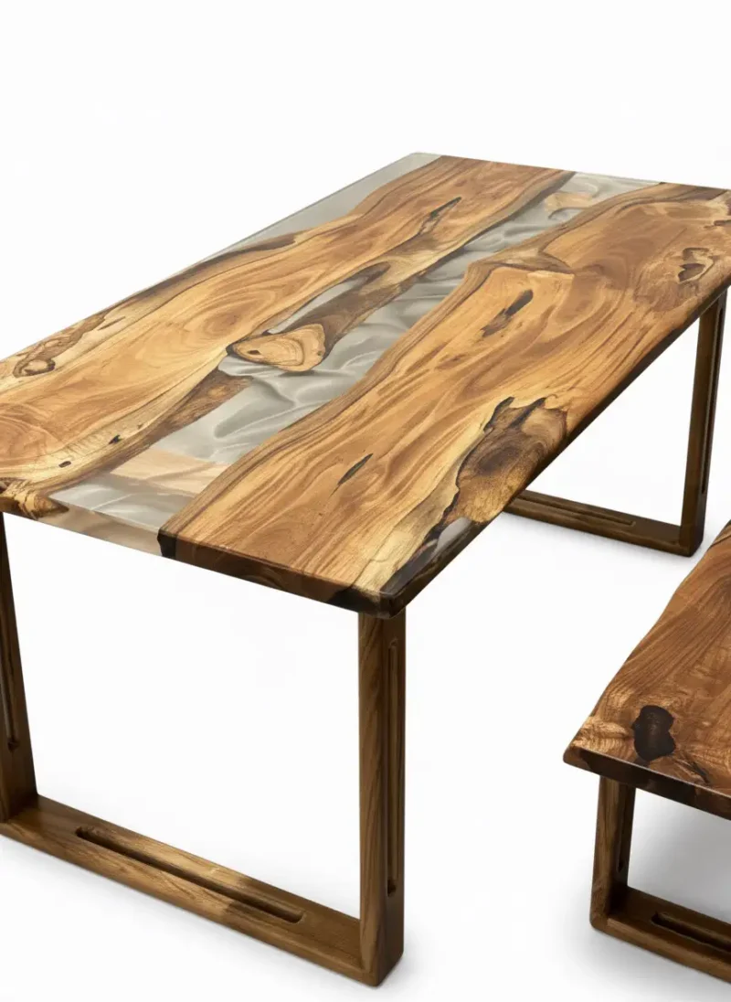 Transform your dining room into a gallery with The Illusion River Dining Set. This exclusive collection features a breathtaking table and a complementary bench, both showcasing the unparalleled beauty of Rohida wood enhanced by a unique 3D transparent epoxy resin effect.
