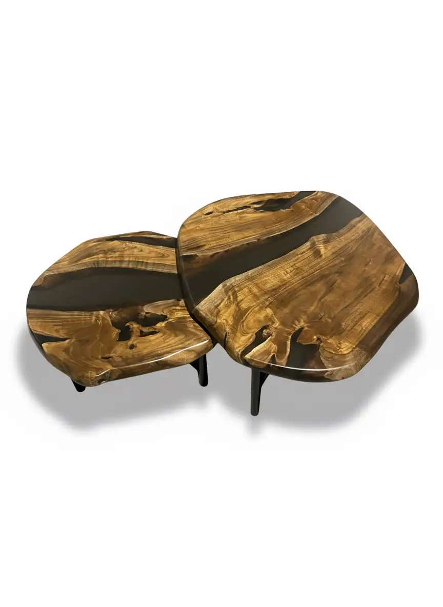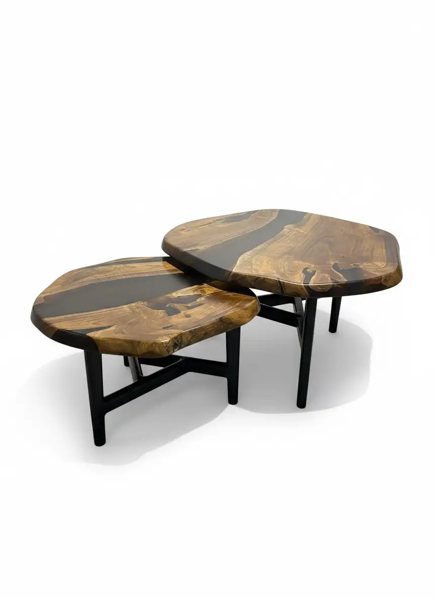 Elevate your living space with this exquisite set of two nesting tables, a perfect blend of natural beauty and contemporary design. Crafted from rich, highly figured Rohida wood, each tabletop features a unique, organic live edge, ensuring no two pieces are exactly alike.