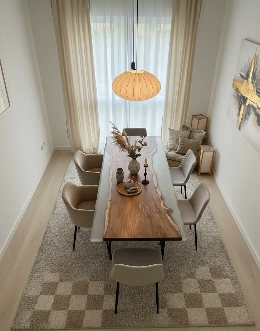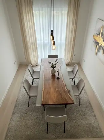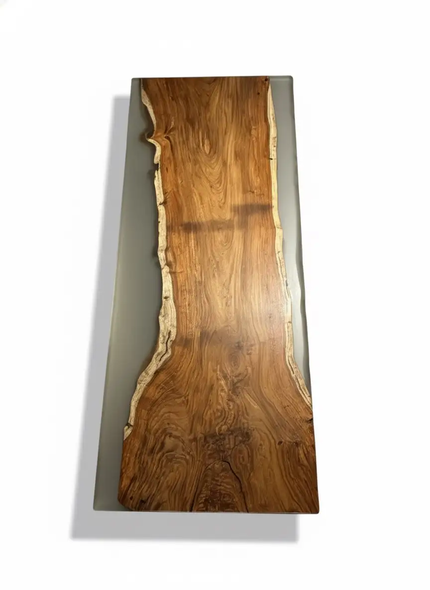 • Subtle Grey Epoxy Resin: The dramatic live edge is encased in a sophisticated grey transparent epoxy resin. This “slate river” effect is a muted and modern alternative to traditional vibrant resins, offering an effortlessly chic look that complements any decor scheme.